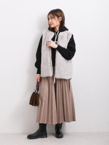 ダウンジャケットやファー素材のアイテムは、保温性が高く、軽量なので、寒い季節には魅力的なアウターのひとつです。ただし、カジュアル過ぎてしまったり、季節的にどうなの?と思ってしまうこともありますね。こんな時におすすめしたいのが、明るめのベージュやホワイト系カラーのアイテムを選ぶこと。寒い季節のコーディネートの主役となるアウターに、明るめカラーを選ぶと印象が変わります。