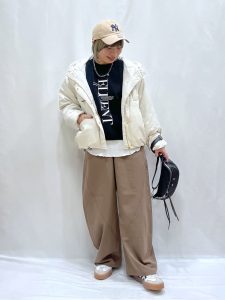 カジュアルなダウンジャケットですが、カラー次第で落ち着いた雰囲気に見せることができます。こちらのようにホワイト×ベージュの組合せは、手軽に落ち着いた雰囲気と女性らしさを加えることができます。軽くて暖かい、ダウンを大人っぽく落ち着いた雰囲気で楽しみたい時はカラー選びを工夫してみてください。カジュアルなアイテムを、上手にコーディネートすると今っぽさをプラスできますよ。