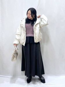 2-2.スカート派さんのダウンジャケットコーディネートはボリューム控え目の仕上げる
