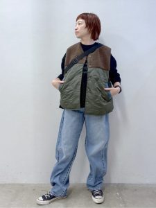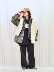 このコーデで取り入れている Our.|ボア×ナイロン リバーシブルベスト は、ボリューム感のあるボア素材ながら、切替とシルエットですっきり見えを叶えてくれる一枚です。