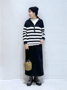 ニットやボーダートップスと合わせることで、カジュアルながらも可愛らしさのある着こなしに。