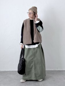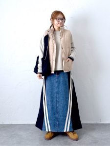 デニムスカートは程よくラフな印象ですが、コーデュロイベストを重ねることで一気に落ち着きと上品さが加わります。