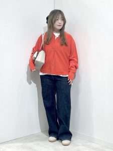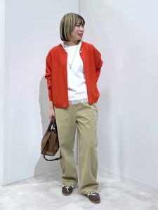 シンプルなデザイン、素材のボトムスなので、お出かけからデイリースタイルまで幅広く楽しむことができますよ。Tシャツやシャツはもちろん、きれいめなトップスとの相性が良く幅広いスタイリングで活躍してくれる着回し力の高い1枚としてもおすすめ。今回は、赤の2wayカーディガンとのコーディネートです。白のインナーをレイヤードすることで、赤が主張することなくスタイリッシュですよね。