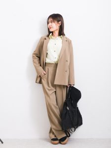 春にぴったりなベージュカラーのセットアップは、オフィスからデイリーまで幅広く活躍してくれるアイテムです。ベーシックなシルエットだからこそ、さまざまなシチュエーションで自分らしく楽しむことができるのが魅力です。ただし、コーディネートがマンネリ化してしまう可能性があるためインナーを変化をつけてみてはいかがでしょうか。こちらのようなカラーシャツやニット、素材感を変えましょう。