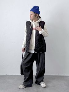 黒のキルティングベストにオフホワイトのパーカーを合わせ、ワイドパンツでまとめたスポーティカジュアルなスタイル。