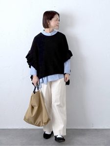 黒のニットベストが引き締め効果を発揮し、全体をすっきりと見せます。