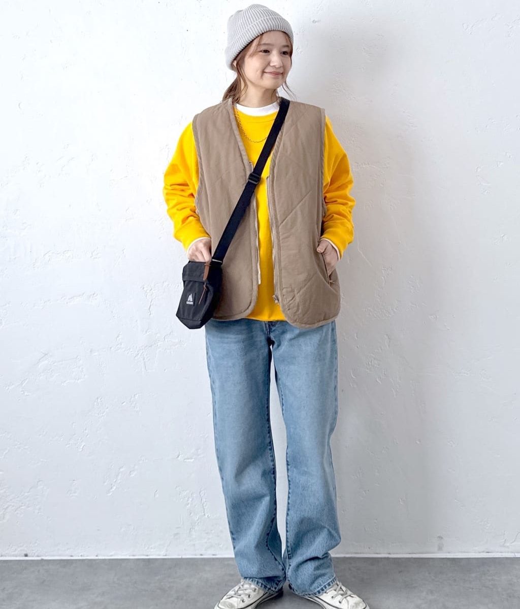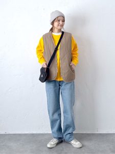 - 10~15℃:キルティングベスト+スウェット+デニムの基本スタイルで快適。