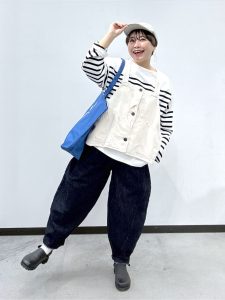 ボーダー柄は横のラインが気になる方もいますが、キルティングベストを重ねることで縦のラインが強調され、スタイルアップ効果が生まれます。