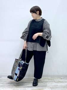 パッチワーク柄のトートバッグがアクセントになり、モノトーンコーデに遊び心を添えています。