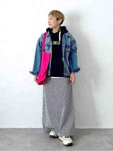 - コーデ①|デニムジャケット×パーカー×ストライプマキシスカート
