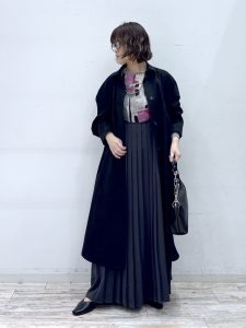 ボトムスはブラックのプリーツマキシスカートで、全体をシックにまとめた大人の黒コーデ。
