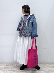 - コーデ②|デニムジャケット×ボーダー×白マキシスカート