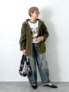 - コーデ③|カーキモッズコート×グラフィックT×ワイドデニム