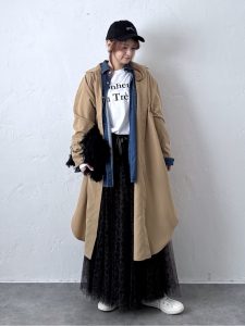 - コーデ④|トレンチコート×デニムシャツ×チュールスカート