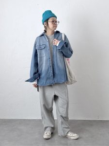 コーデ⑦|デニムシャツジャケット×グレーニット×ワイドスウェット