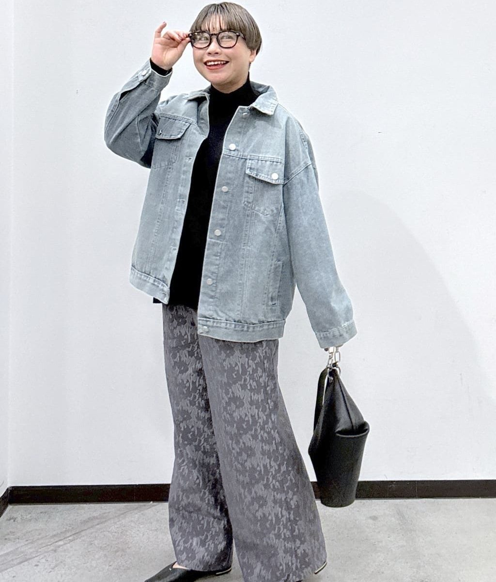 - コーデ⑧|ライトデニムジャケット×ブラックタートル×ジャカードワイドパンツ