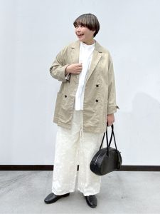 - コーデ⑤|ベージュダブルジャケット×ホワイト刺繍ワイドパンツ