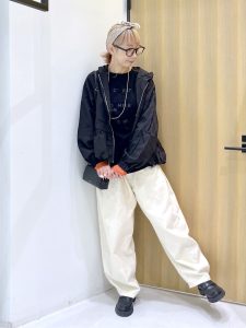 - コーデ⑨|ブラックアノラック×グラフィックT×オフホワイトワイドパンツ