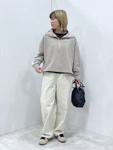 ボトムスは、タック入りの立体的なシルエットが特徴のゆったりシルエットを選んでいます。ほどよい落ち感とゆったり感が気になる脚のラインなどをカバーしますよ。落ち感があるパンツなので、綺麗めにもカジュアルなコーディネートでも活躍する着回し力が高い1枚です。ウエスト部分にはロゴデザインの幅広ゴムが使われているため、トップスインもアウトでもスタイリッシュに見せることができます。
