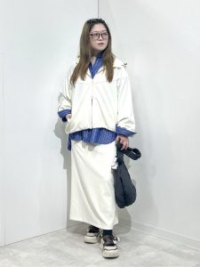 ジャージ素材は着心地がよく快適に過ごすことができますが、コーディネートによっては部屋着感が強くなるのが悩み。綺麗めやベーシックカラーを選ぶことで落ち着いた雰囲気に仕上げることができますよ。こちらのようにインナーにカラーシャツを選ぶことで、レイヤードスタイルにアクセントをつけることができます。スッキリ感と、抜け感のあるコーディネートとして楽しめるのではないでしょうか。