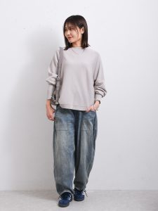 ベージュカラーのパンツは、カジュアルなアイテムも上品に見せることができます。ゆったりとしたシルエットのワイドパンツは、ウエストやヒップラインを上手にカバーしてくれます。体型カバーしたい時は、隠すのではなく落ち感のある生地を選ぶなど工夫することで理想のスタイルを楽しむことができます。カジュアルなアイテムを綺麗目に見せたい時に、ワイドパンツはバランスよく仕上がりますよ。