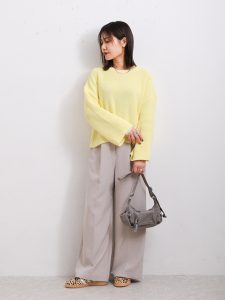落ち感が大人っぽいウエストロゴデザインのタックパンツは、カジュアルすぎることなく落ち着いた雰囲気を楽しむことができるボトムス。シンプルですが細かなディテールが魅力的なので、幅広いスタイルを楽しむことができます。今回は、レモンカラーのニットに裾レースインナーをレイヤードすることでフェミニンな雰囲気を加えてコーディネート。レース素材や花柄など、春らしさを楽しめますよね。