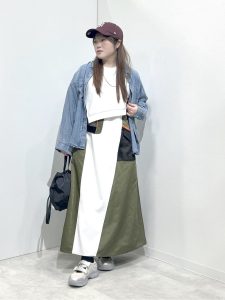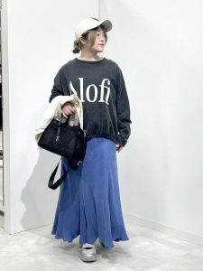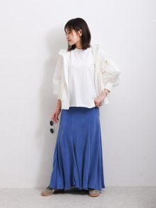 40、50代の女性がスウェットやロゴTシャツなどカジュアルなアイテムを取り入れる時、ボトムスにロングスカートやワイドパンツを選んでください。ロングスカートやワイドパンツは、気になるウエストやヒップ、脚のラインを上手にカバーしながら女性らしさを楽しむことができるアイテムです。足元をスニーカーにすることで、抜け感につなげることもでき、春夏コーディネートで活躍してくれる1枚です。