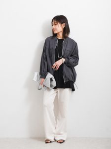 こちらのシアーワークブルゾンは、このような悩みも解決してくれる1枚としてもおすすめ。ふんわりしたシルエットですが、裾のドローストリングでシルエットを手軽に変えて楽しめるのもポイントが高いですよね。少し長めの着丈なので、ヒップラインを上手にカバーしてくれる点も嬉しいアイテムです。シンプルで使いやすいカラーなので、幅広いコーディネートに考えることなくプラスできますよ。