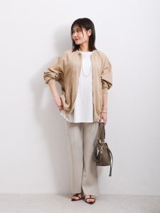 ワンピースの羽織りとしてはもちろん、スカート、パンツなどさまざまなアイテムとコーディネートしやすいデザインはポイントが高いですよね。ベージュ、アイボリーと女性らしいカラーの2色展開。気温が変わりやすい春には1枚あると便利なアイテムとしておすすめです。今回は、ベージュからホワイト系のコーディネートのアクセントとしてプラスしています。ほどよいふんわり感も嬉しい1枚ですよね。