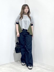 バックプリーツメッシュとブランドタグがデザインされていて、マニッシュな雰囲気を楽しむことができます。首元、袖口の部分にトレンドのチュール素材を使用することで透け感があります。シンプルなアイテムですが、細部にこだわりのあるトップスなので、デニムコーディネートを選ぶことで、すっきり、今っぽく仕上げることができます。メリハリのあるコーディネートにすることで、甘すぎを抑えます。