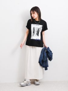 トレンドのグラフィックTシャツは、ボリューム控えめのナロースカートとコーディネートすると大人っぽさと適度なカジュアル感を楽しめます。Tシャツを使ったコーディネートもバランス次第で、落ち着いた雰囲気で大人っぽく仕上げることができます。シルエット以外にも、スタイリッシュに見せるにはカラー使いがポイント。3色以内のカラーだけでコーディネートすることでよりお洒落に見えますよ。