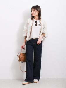 2-3.フェミニンになりがちなレースブルゾンはTシャツと組合わせてカジュアルダウンする