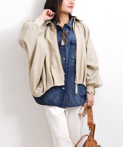 丸みのあるシルエットが印象的なラウンドギャザードルマンブルゾン。ゆったりとしたドルマンスリーブが生み出す抜け感と、たっぷりと寄せたギャザーが女性らしい柔らかさを演出。肩まわりに自然なボリュームを持たせることで、羽織るだけで立体感のあるスタイリングが完成します。