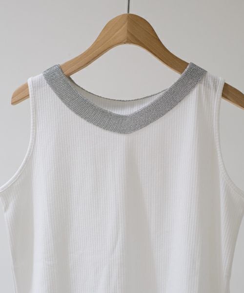 ラメフィルムを巻いた糸を編んだアビガイルテープを首回りに施したタンクトップ。前後2wayで使えて、夏のレイヤードスタイルに最適です。柔らかな肌触りも◎色違いで揃えたい一着です。