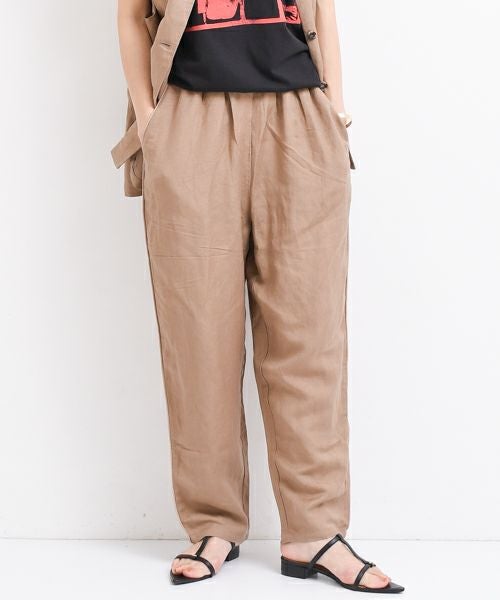 上品な落ち感が女性らしい印象に仕上がるテーパードパンツ。マーブルBlueは、当店だけのオリジナル生地を使用した、こだわりが詰まった特別カラー。L.Brown,Blackはリネン混の軽やかな素材で、涼やかさとナチュラルな風合いを両立。オンにもオフにも馴染み、Tシャツからブラウスまで幅広く着まわせる、大人の毎日に寄り添う一本です。L.Brown,Blackは同素材のベストとセットアップでご使用いただけます。