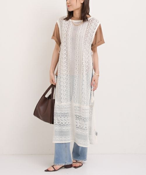 ヴィンテージ感のあるレースを使用したロングジレワンピース。サイドにざっくりとスリットが入り、抜け感のあるレイヤードコーデが完成。裾のパッチワークがデザインのアクセントになり、透かし柄がトレンド感をプラスします。春はシアーインナーを重ねて、夏はタンクやベアトップでヘルシーな肌見せを楽しめます。ジャケットを羽織れば今年らしいスタイリングに。デニムや落ち感のあるイージーパンツとの相性も抜群で、こなれた着こなしが叶います。