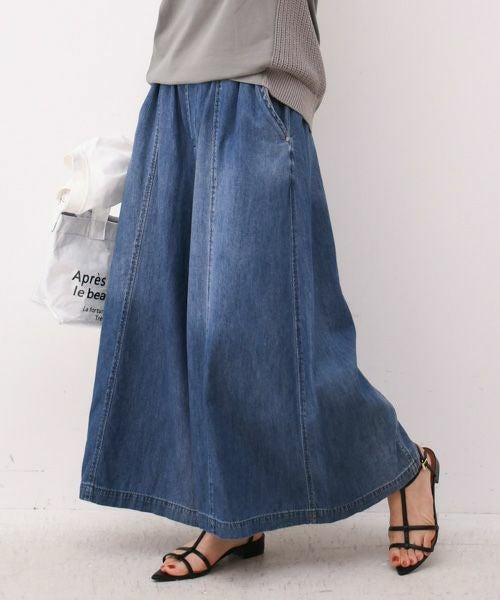 スカート見えするフレア感がポイントの超ワイドライン。前後に施した切替がボリュームを程よく抑えてくれてデザインのアクセントにも。甘織のソフトデニムで非常に軽くストレスフリーな履き心地です。ウエストは総ゴムで内側にスピンドルも付いており調節も可能です。