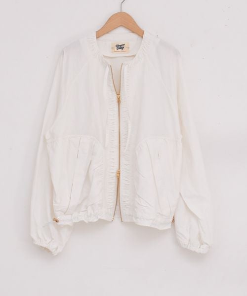 カジュアルながらも上品な雰囲気を纏う、MARGAUX VINTAGEのノーカラーブルゾン。ナイロン100%の撥水素材を使用しており、季節の変わり目に重宝する、機能的でおしゃれなアイテムです。