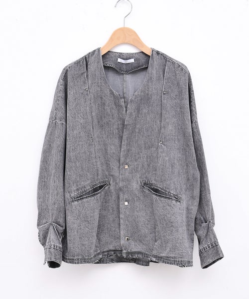 6ozの軽やかなデニム素材に、存在感のある箔プリントを施したノーカラージャケット。首元はすっきりとしたノーカラーデザインで、インナーを選ばず抜け感のある着こなしが可能。箔プリントは一点一点手作業で加工されており、仕上がりには個体差があり、それぞれ異なる表情をお楽しみいただけます。同じものが二つとない、特別感のあるアイテムです。