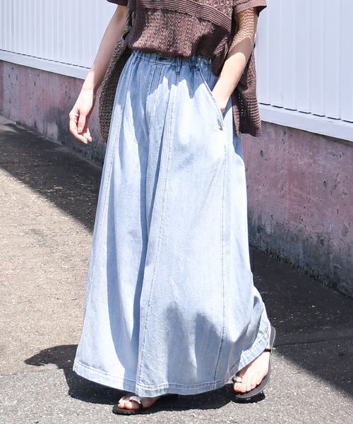 スカート見えするフレア感がポイントの超ワイドライン。前後に施した切替がボリュームを程よく抑えてくれてデザインのアクセントにも。甘織のソフトデニムで非常に軽くストレスフリーな履き心地です。ウエストは総ゴムで内側にスピンドルも付いており調節も可能です。