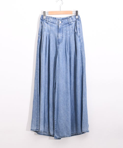 シルクのような自然な光沢感で、柔らかくしなやかな素材です。再生繊維ならではの肌への優しさ、吸水速乾性による快適な着心地を提供します。リラックス感あるワイドシルエットながらも、タック入りのウエスト周りが上品な印象を与え、存在感ある加工とのバランスが絶妙な1着です。