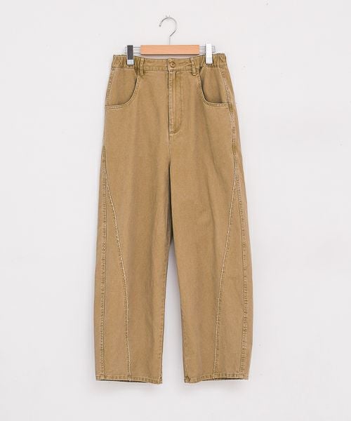 程よいハリ感のあるコットン素材に、ウォッシュ加工を施したワイドパンツ。切替デザインがさりげないアクセントになり、シンプルながらも表情のある一本です。リラックス感のあるワイドシルエットで、体のラインを拾いにくく、デイリーに快適な穿き心地。Tシャツやシャツはもちろん、きれいめトップスとも相性が良く、幅広いスタイリングに活躍します。