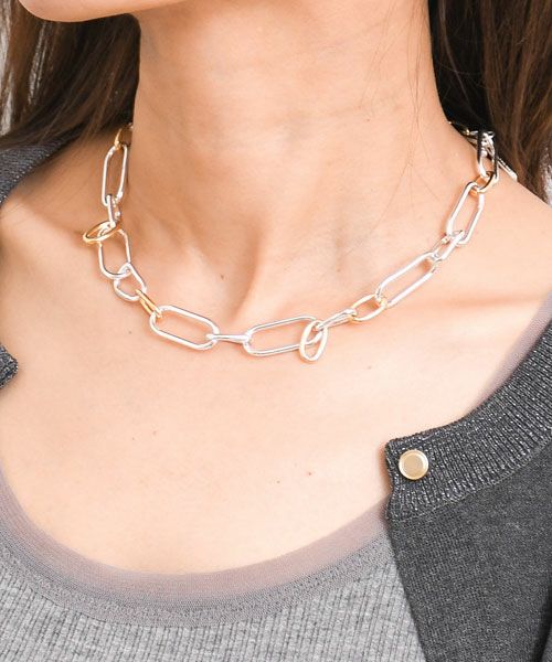 サイズやカラーの異なるパーツを組み合わせたチェーンネックレス。 ランダムに配置されたデザインが、コーディネートにさりげないアクセントを添えてくれます。 ■シルバー925プレーティング 銀製品同様、時間が経つにつれて黒ずんできますが、その場合はクロスなどで優しくお拭き取りください。 プレーティングですので、付けたまま入浴や、水仕事などはおやめください。 ■14K ゴールドプレーティング 金製品同様、時間が経つにつれて黒ずんできますが、その場合はクロスなどで優しくお拭き取りください。 プレーティングですので、付けたまま入浴や、水仕事などはおやめください。 ■一般的に金属アレルギーを起こしやすいと言われている物質(ニッケル、クロム、マンガン、コバルト)を殆ど含んでおりません。 ※モニター・環境等により、実際の商品と多少色味が異なって表示される場合がございます。予めご了承願います。