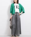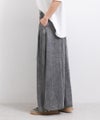 シルクのような自然な光沢感で、柔らかくしなやかな素材です。再生繊維ならではの肌への優しさ、吸水速乾性による快適な着心地を提供します。リラックス感あるワイドシルエットながらも、タック入りのウエスト周りが上品な印象を与え、存在感ある加工とのバランスが絶妙な1着です。