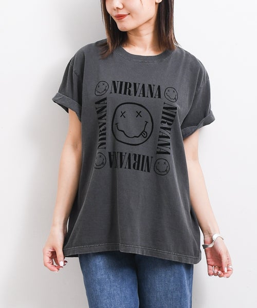 グランジシーンを象徴するバンド NIRVANA のアイコニックなスマイルロゴをあしらった一枚。立体感のあるフロッキープリントで表現されたアートワークが、シンプルながらも存在感を演出します。ピグメント染めのヴィンテージライクな風合いと、程よく抜け感のあるデザインで、1枚着はもちろんレイヤードにも活躍。カジュアルからストリートまで幅広いスタイリングにフィットする、主役級Tシャツです。
