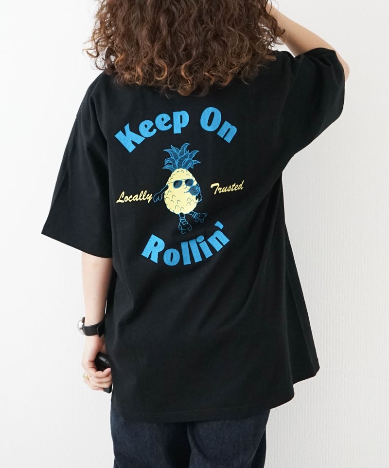 シュールで愛嬌のあるパイナップルボーイがマスコットを務める地元のスケボーショップのショップTシャツをイメージし、 1970~80年代のポップカルチャー風のデザインに落とし込んだプリント。