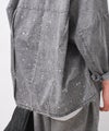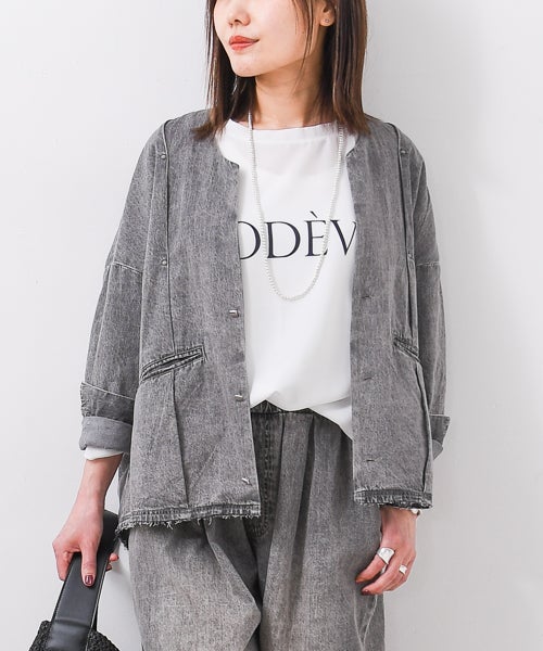 6ozの軽やかなデニム素材に、存在感のある箔プリントを施したノーカラージャケット。首元はすっきりとしたノーカラーデザインで、インナーを選ばず抜け感のある着こなしが可能。箔プリントは一点一点手作業で加工されており、仕上がりには個体差があり、それぞれ異なる表情をお楽しみいただけます。同じものが二つとない、特別感のあるアイテムです。