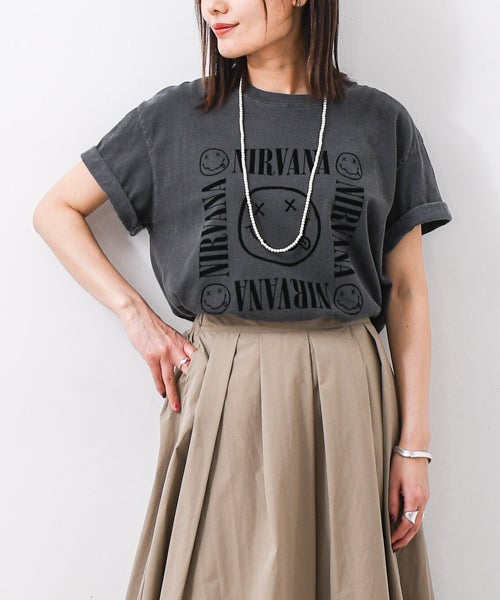 グランジシーンを象徴するバンド NIRVANA のアイコニックなスマイルロゴをあしらった一枚。立体感のあるフロッキープリントで表現されたアートワークが、シンプルながらも存在感を演出します。ピグメント染めのヴィンテージライクな風合いと、程よく抜け感のあるデザインで、1枚着はもちろんレイヤードにも活躍。カジュアルからストリートまで幅広いスタイリングにフィットする、主役級Tシャツです。