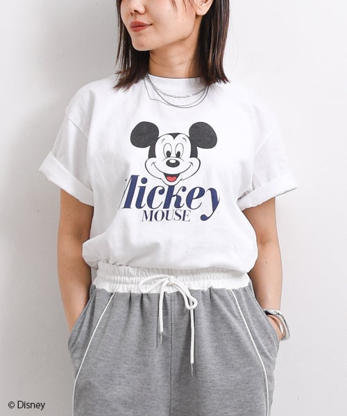 ヴィンテージライクな風合いと、ミッキーの躍動感あふれるデザインが、大人カジュアルなスタイリングにぴったりな1枚です。