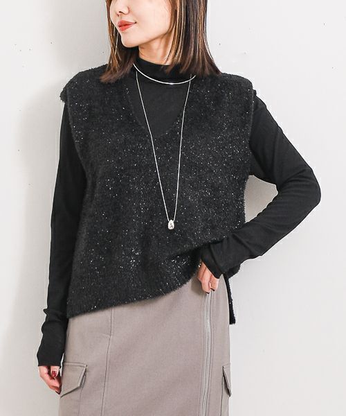 毛足の長いファー調ラメ糸を使用したニットベスト。Vネックとゆとりのある身幅・袖ぐりが、レイヤードスタイルを引き立てるエフォートレスなシルエットを演出します。素材の魅力を活かしたシンプルなデザインで着回しやすく、やや短めの着丈がバランスよく仕上がる一着。冬のコーディネートに上品さを添える、大人のニットトップスです。